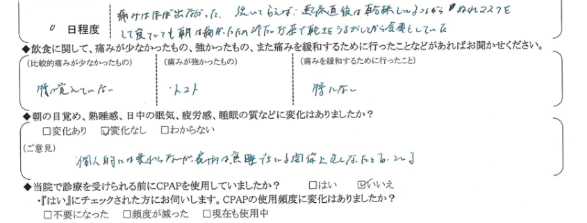 (痛みの程度について) 痛みはほぼ出なかった。しいて言えば起床直後は乾燥していることから、濡れマスクをして寝ていても朝は痛かった為、冷たいお茶で乾きを潤してから食事をしていた。