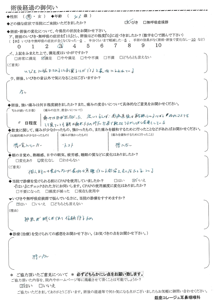 ア, 術前のいびき・無呼吸の症状を『10』だったとすると、術後はどの程度になりましたか? 【3】