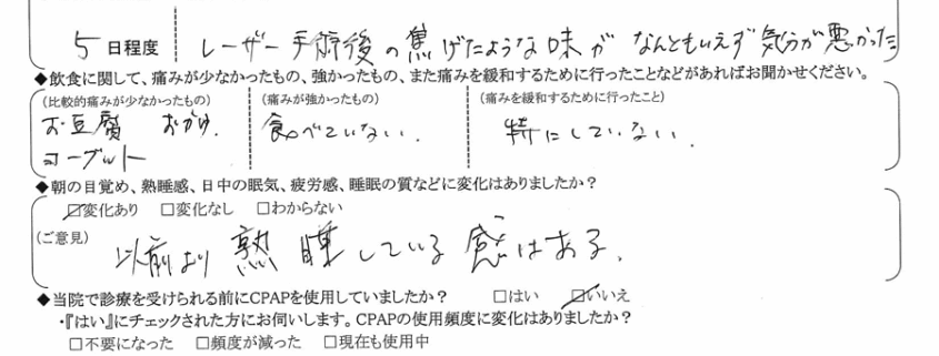 (痛みの程度について) レーザー手術後の焦げたような味が何とも言えず気分が悪かった。