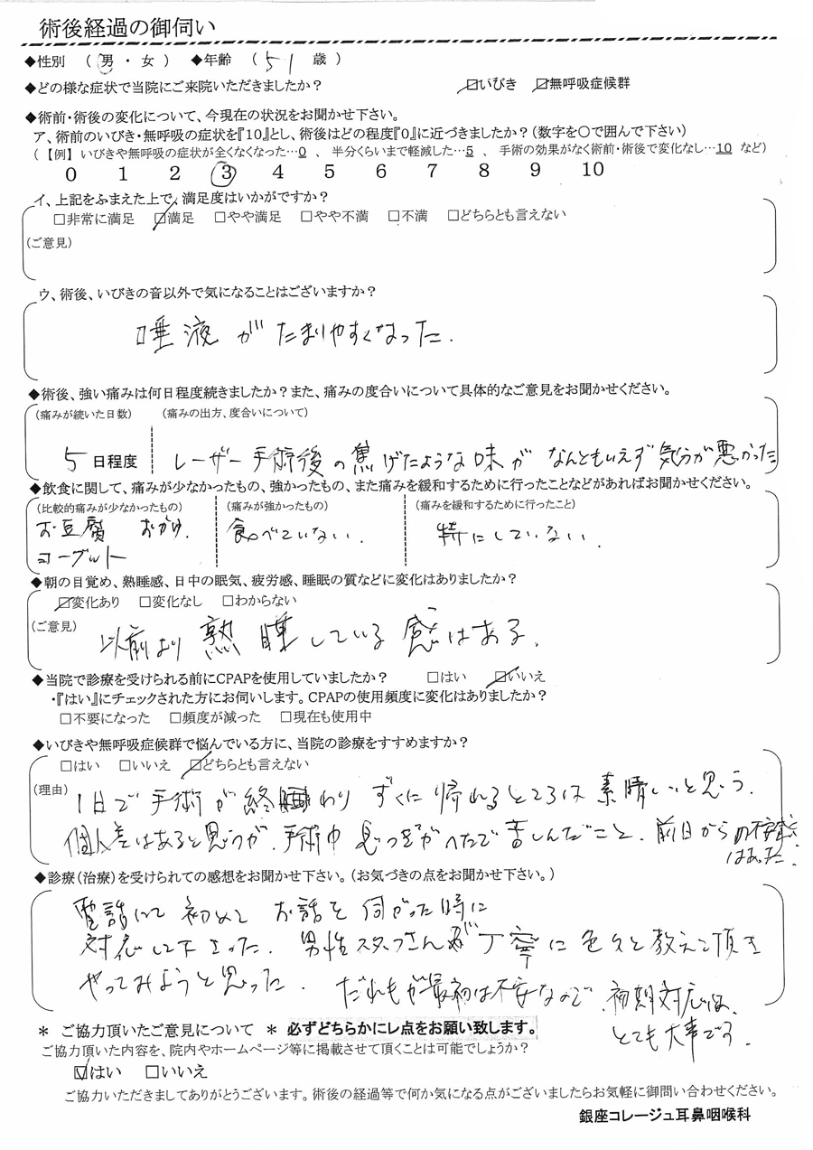 (理由) 1日で手術が終わり、直ぐに帰れるところは素晴らしいと思う。個人差はあると思うが手術中、息継ぎ下手で苦しんだこと・前日からの不安感はあった。