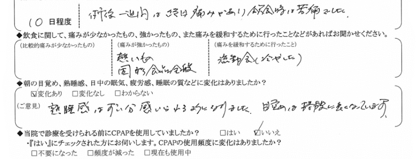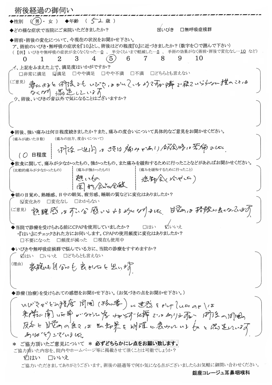 (ご意見) 妻によると術後でもいびきはかいているようですが、隣で寝ていられない程のことは無くなり満足しています。