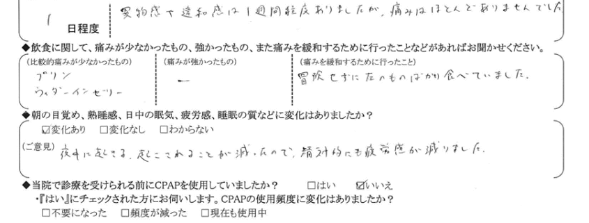 (痛みの程度について) 異物感や違和感は一週間程度ありましたが、痛みはほとんどありませんでした。