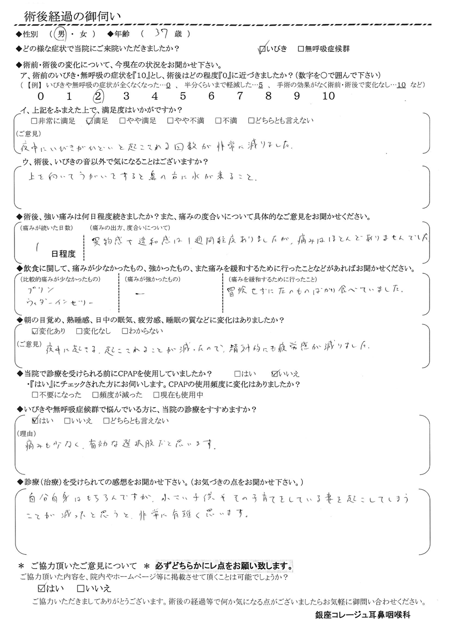 ア, 術前のいびき・無呼吸の症状を『10』だったとすると、術後はどの程度になりましたか? 【2】
