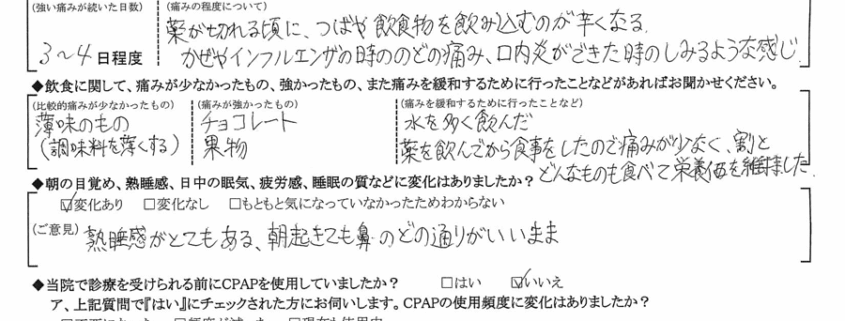 (痛みの程度について) 薬が切れる頃に唾や飲食物を飲み込むのが辛くなる。風邪やインフルエンザの時の喉の痛み、口内炎ができた時のしみるような感じ。