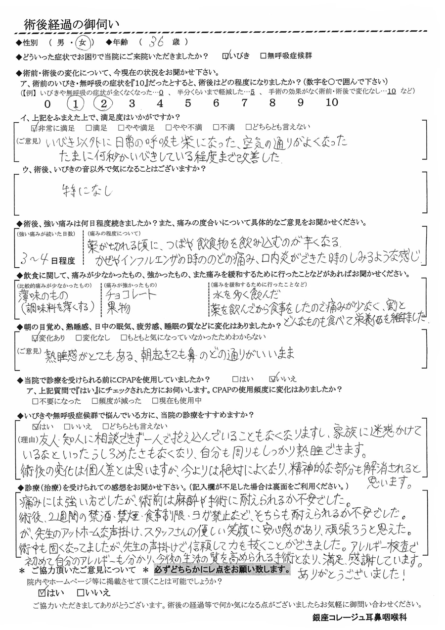 (ご意見) いびき以外に日常の呼吸も楽になった。空気の通りが良くなった。たまに何秒かいびきをしている程度まで改善した。