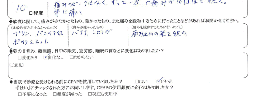 Q.術後、強い痛みは何日程度続きましたか?また、痛みの度合いについて具体的なご意見をお聞かせください。