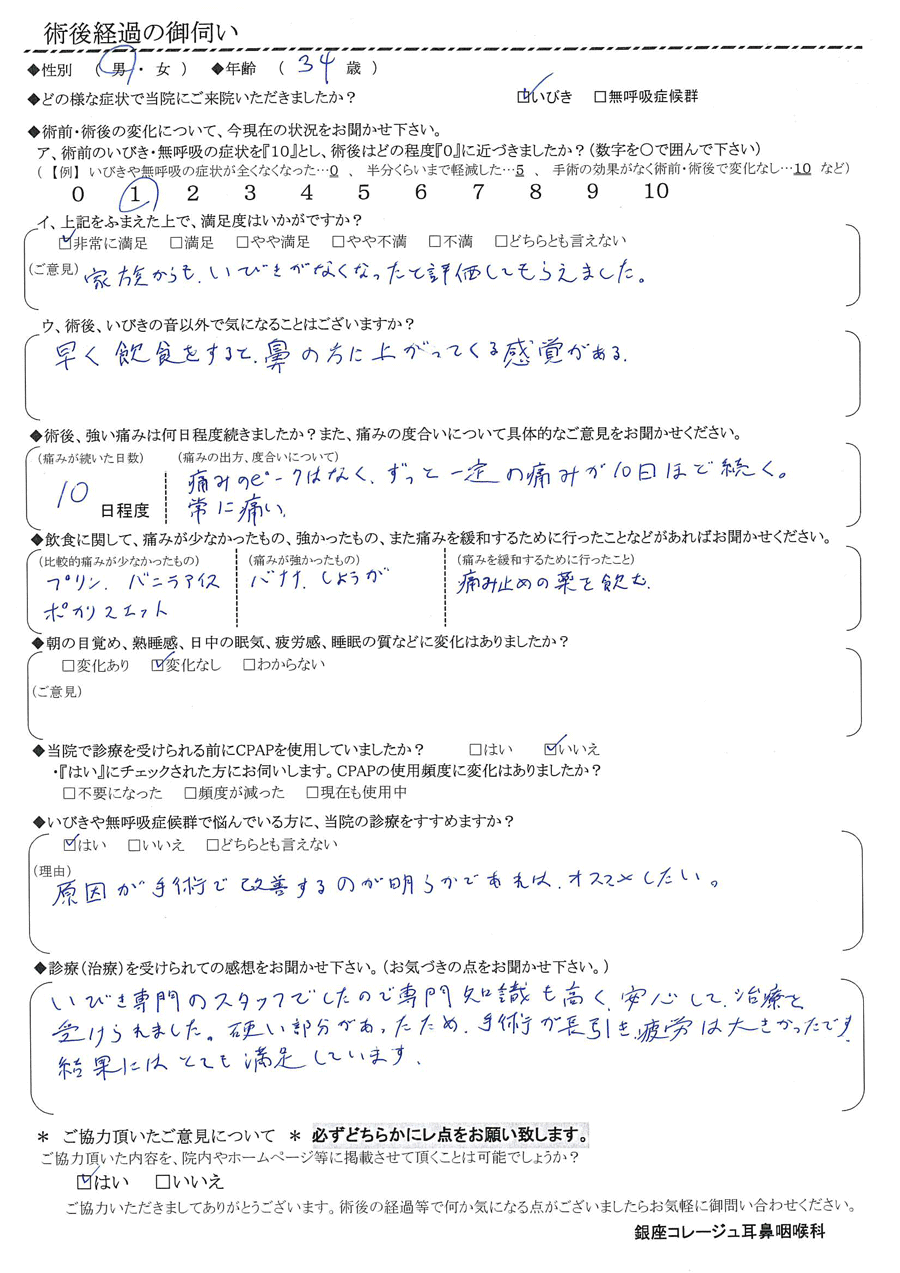 A:いびき専門のスタッフでしたので、専門知識も高く、安心して治療を受けられました。硬い部分があった為、手術が長引き疲労は大きかったです。結果にはとても満足しています。