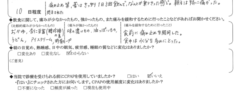 A:(痛みを緩和するために行ったこと) 食前に痛み止めを服用した・食中は水分を多めにとった