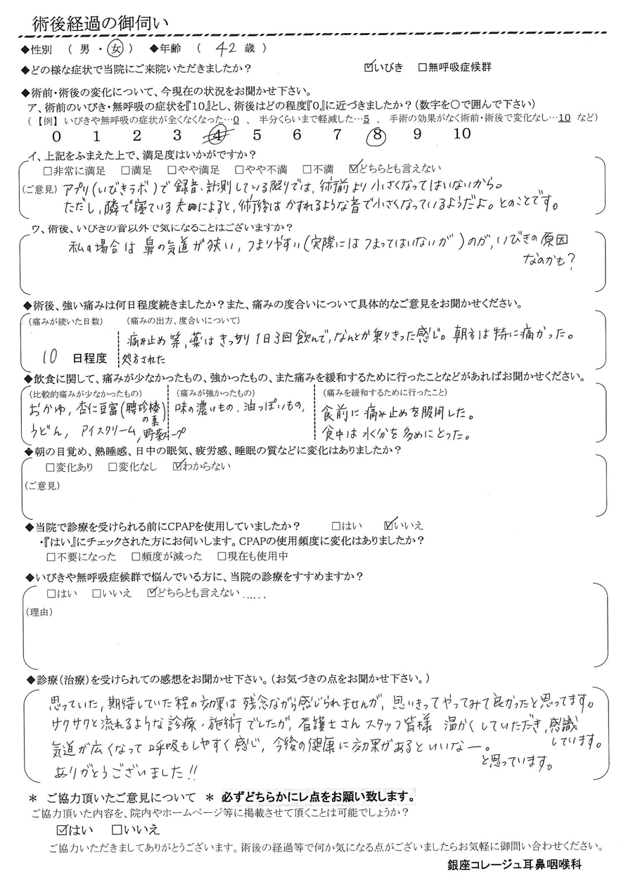 (ご意見)  アプリ(いびきラボ)で録音計測している限りでは、術前より小さくなってはいないから。ただし、隣で寝ている夫によると「術後はかすれるような音で小さくなっているようだよ。」との事です。