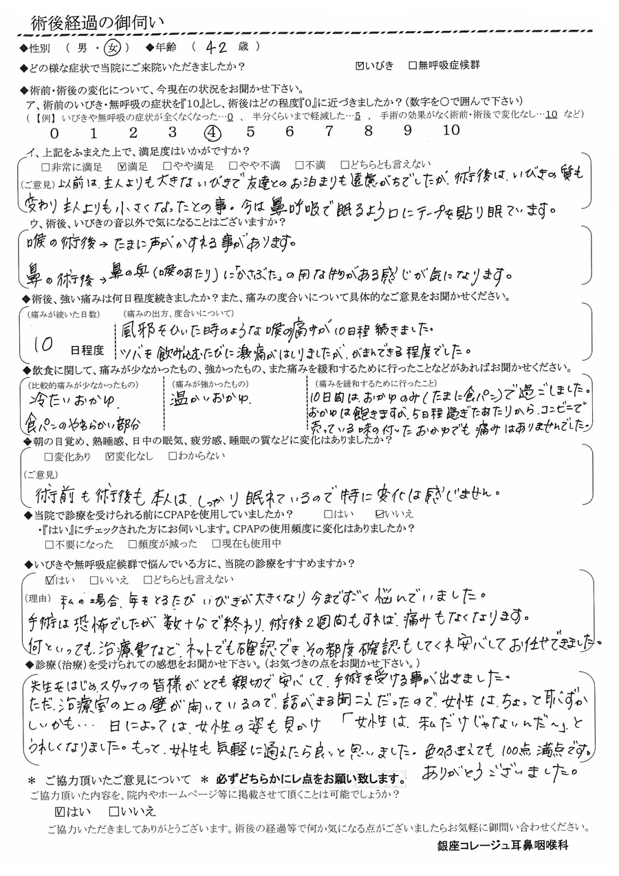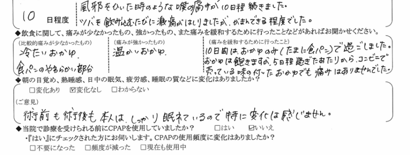 (ご意見) 以前は主人よりも大きなイビキで友達とのお泊りも遠慮がちでしたが、術後はイビキの質も変わり主人よりも小さくなったとの事。今は鼻呼吸で眠るよう、口にテープを貼って寝ています。