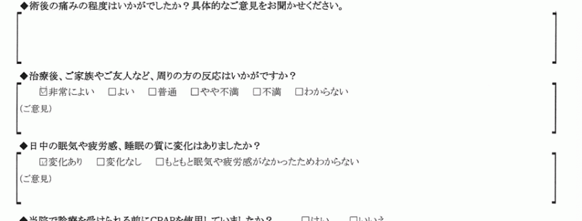 ウ、いびきの音以外で、術後気になる点はございますか?