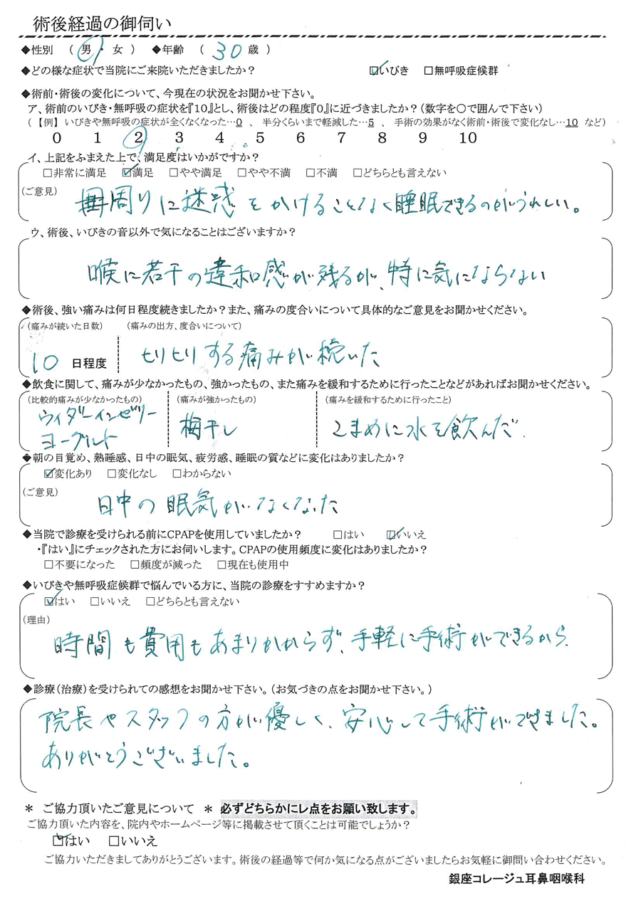 ア, 術前のいびき・無呼吸の症状を『10』だったとすると、術後はどの程度になりましたか? 【2】