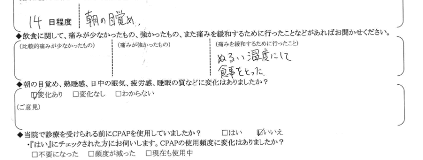 A:(痛みを緩和するために行ったこと) ぬるい温度にして食事をとった