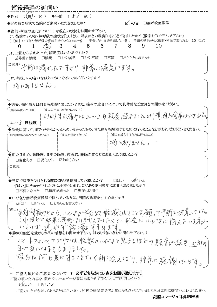 (理由) 事前情報などから、いびきが半分まで軽減されることを願って手術を決意しました。これほどの効果を期待していませんでしたので、身近にいびきに悩んでいる方がいれば迷わず診療をすすめます。