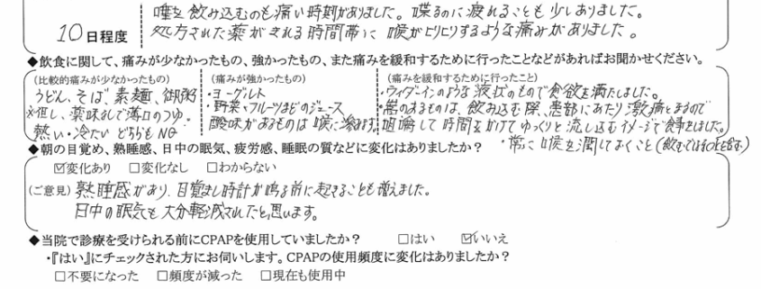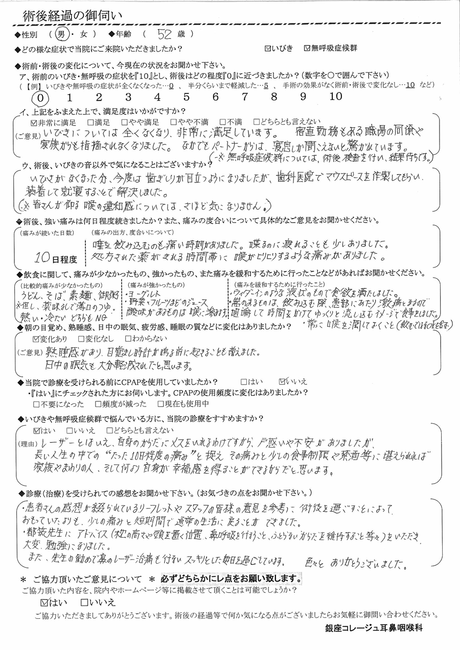 (ご意見) いびきについては全く無くなり、非常に満足しています。宿直勤務もある職場の同僚や家族からも指摘されなくなりました。なかでもパートナーからは「寝息しか聞こえない」と驚かれています。(※無呼吸症候群については術後、検査を行い結果待ちです)