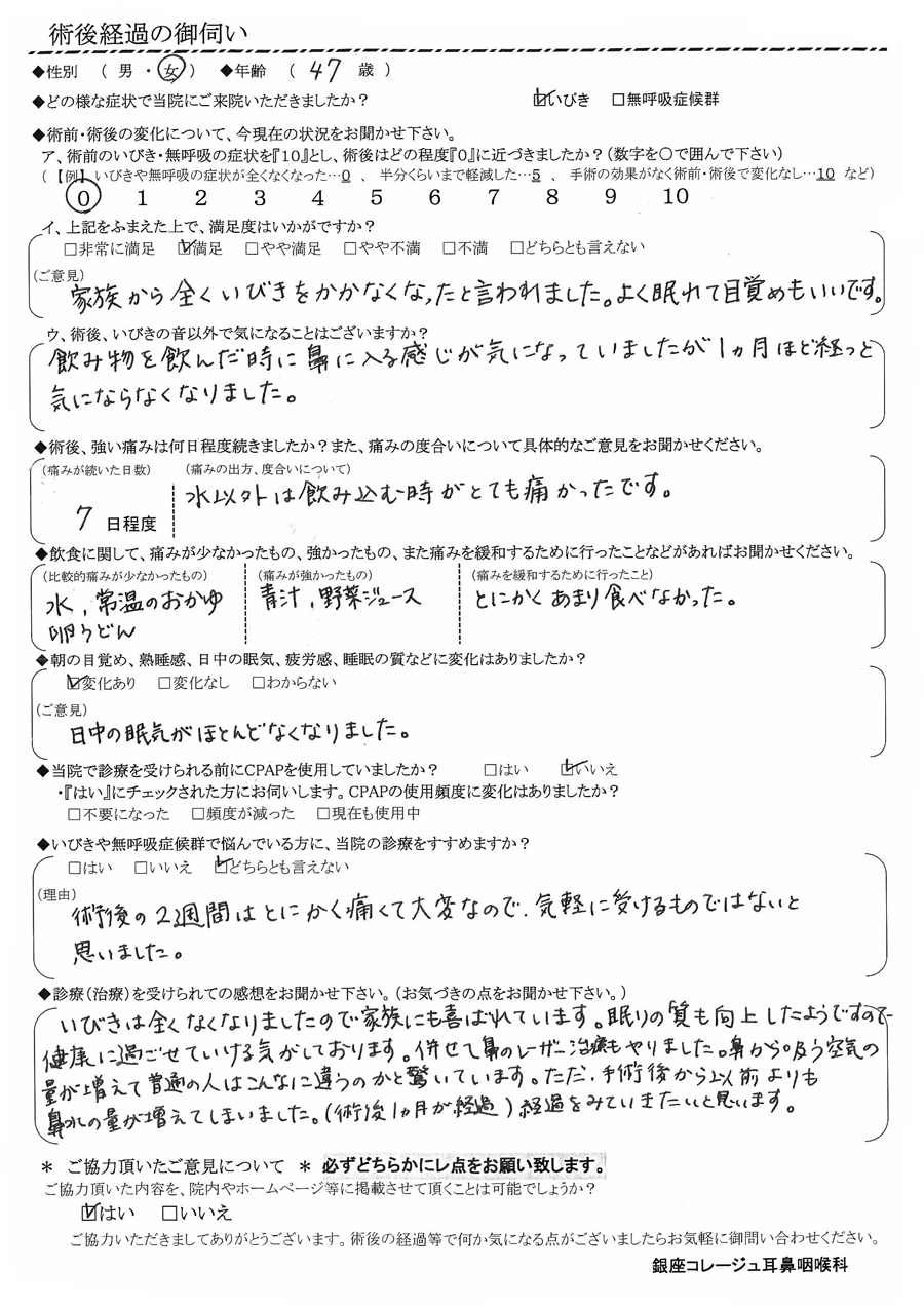 A:いびきは全く無くなりましたので、家族にも喜ばれています。眠りの質も向上したようですので、健康に過ごせていける気がしております。併せて鼻のレーザー治療もやりました。鼻から吸う空気の量が増えて、普通の人はこんなに違うのかと驚いています。ただ、手術後から、以前よりも鼻水の量が増えてしまいました。今後経過を見ていきたいと思います。
