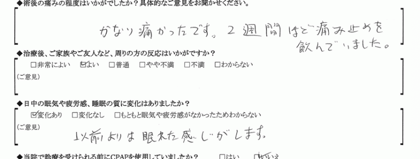 A:施術後の痛みはかなりありましたが、いびきがなくなって満足しています。