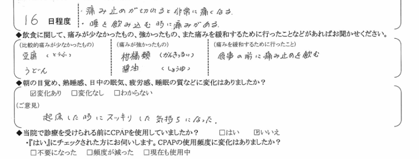 (痛みの程度について) 痛み止めが切れると非常に痛くなる。唾を飲み込む時に痛みがある。