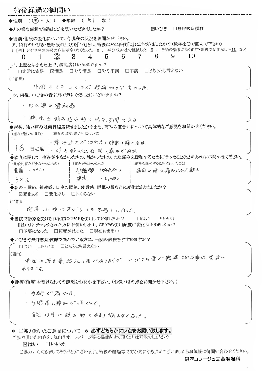 (ご意見)  手術をして、いびきが軽減できて良かった。