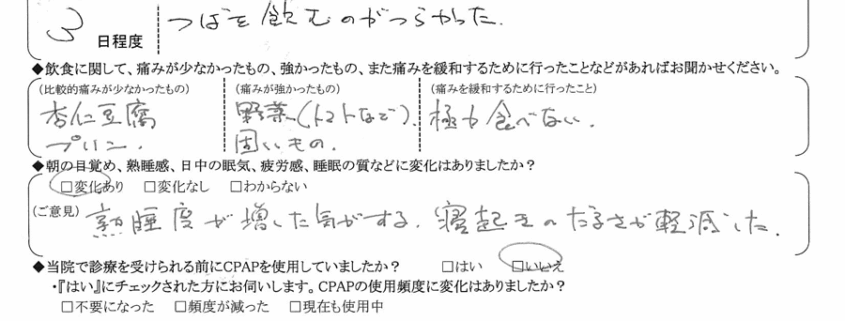 A:妻が「いびきがだいぶ軽減した。」と、言ってくれたので手術を受けて満足しています。断食道場を体験できた気がして、体がリセットしました(3㎏ほど痩せた)。