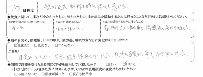 (ご意見) いびきは少しあるが、気にならないレベルになった。無呼吸は改善された。