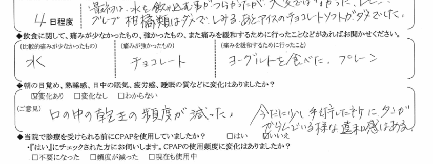 (痛みの程度について) 最初は水を飲む事が辛かったが大変ではなかった。