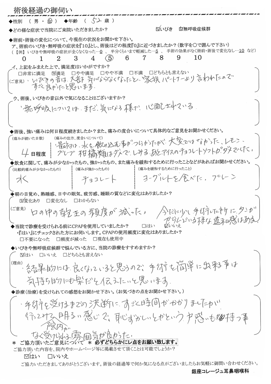 (ご意見) いびきの音は「だいぶ気にならなくなった」と、家族・パートナーより言われたので、凄く良かったと思います。