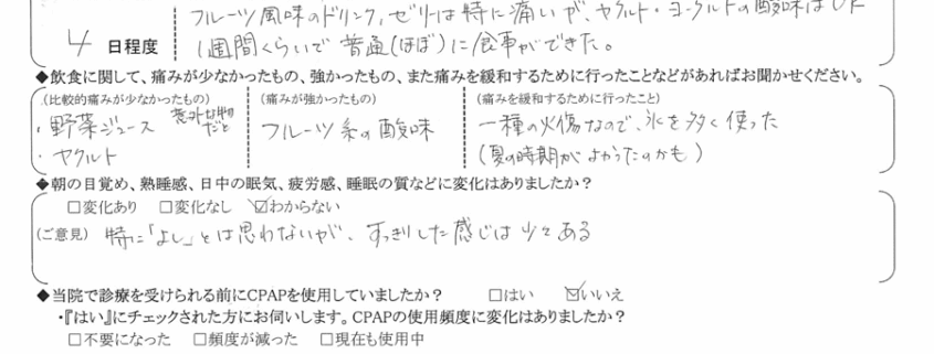 (痛みの程度について) フルーツ風味のドリンク・ゼリーは特に痛いが、ヤクルト・ヨーグルトの酸味はOK。