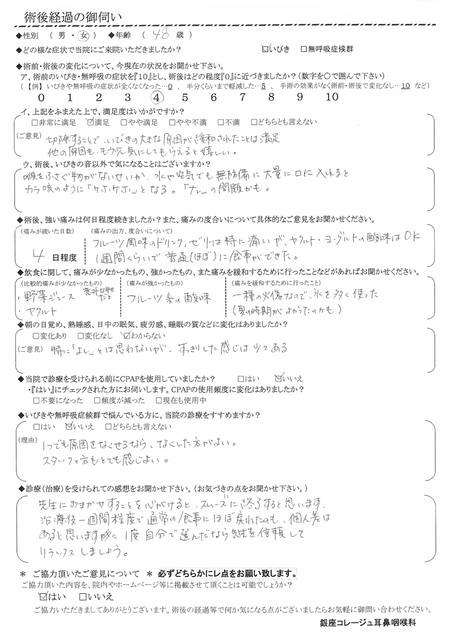 (ご意見) 切除することで、いびきの大きな原因が緩和されたことは満足。他の原因も、もう少し気にしてもらえると嬉しい。