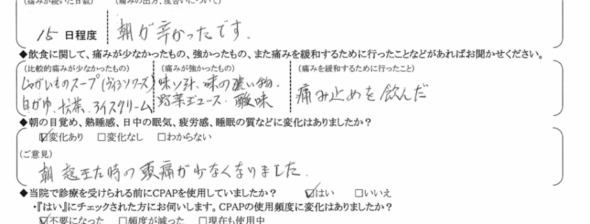 A: 朝、起きた時の頭痛が少なくなりました。