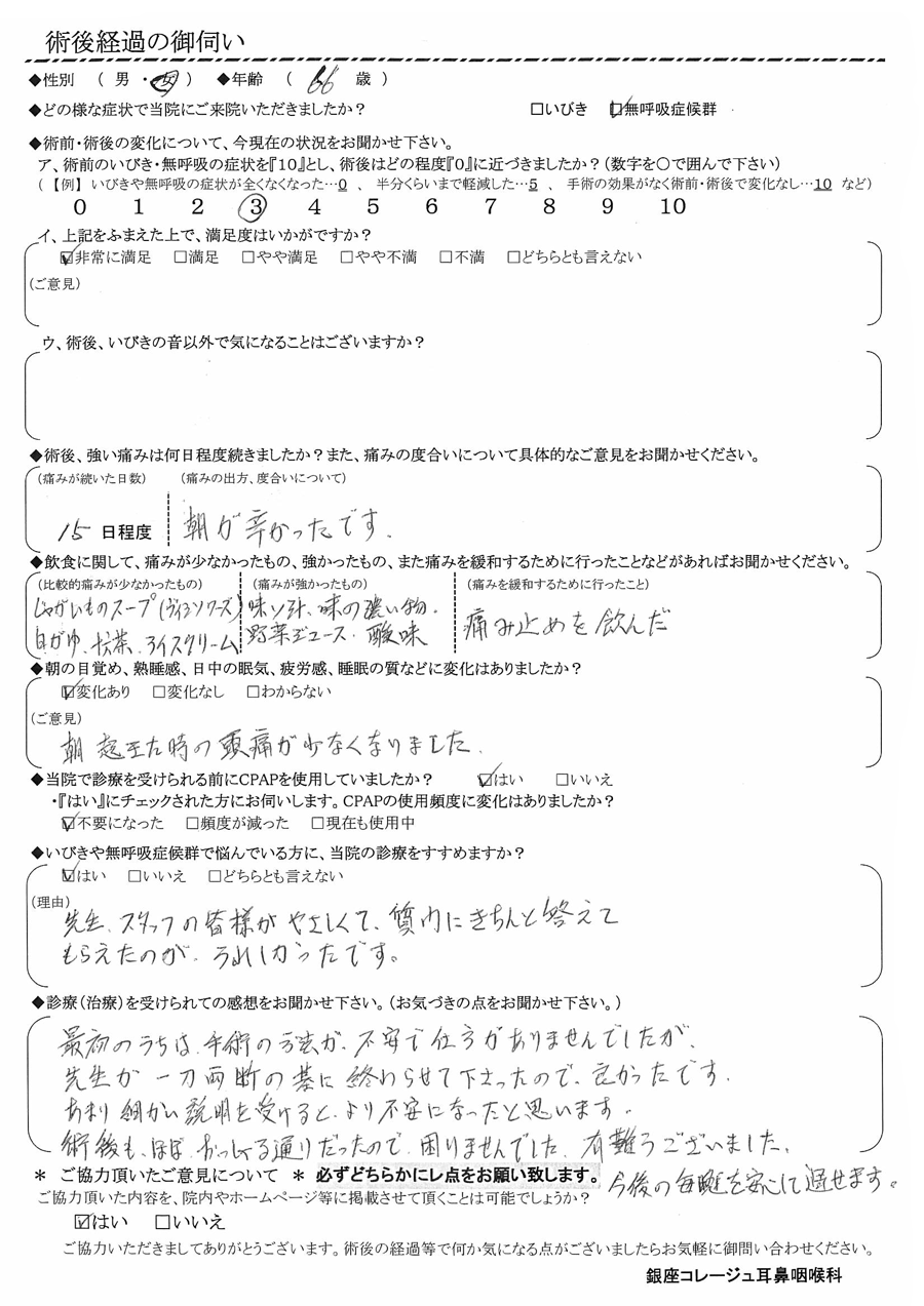 ア, 術前のいびき・無呼吸の症状を『10』だったとすると、術後はどの程度になりましたか? 【3】