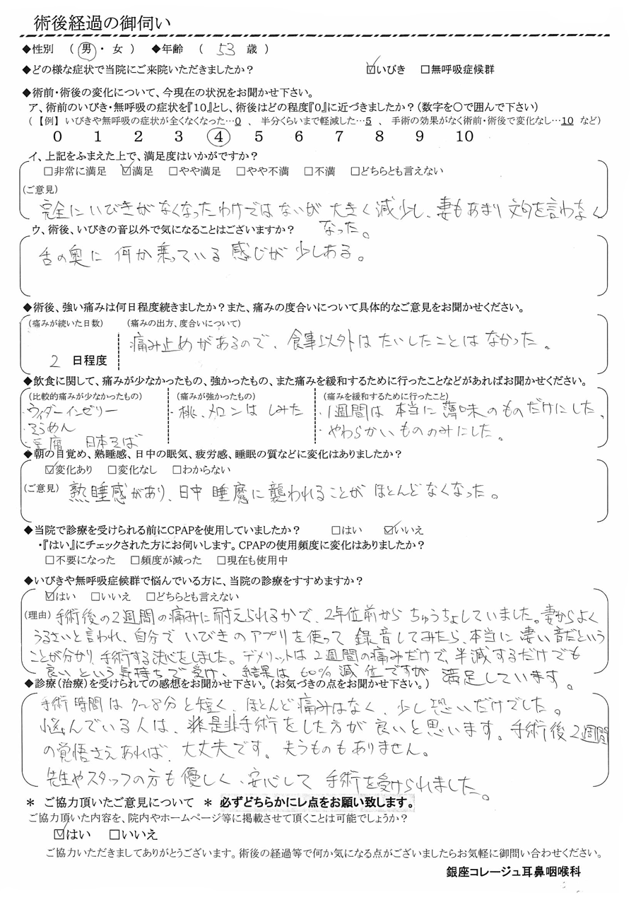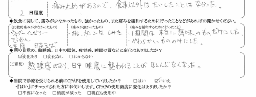 (理由) 手術後の二週間の痛みに耐えられるかで、二年位前から躊躇していました。妻からよく「うるさい」と言われ、自分でイビキのアプリを使って録音してみたら本当に凄い音だという事が分かり、手術する決心をしました。