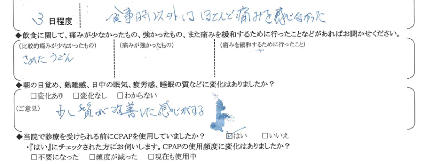 (痛みの程度について) 食事時以外はほとんど痛みを感じなかった。