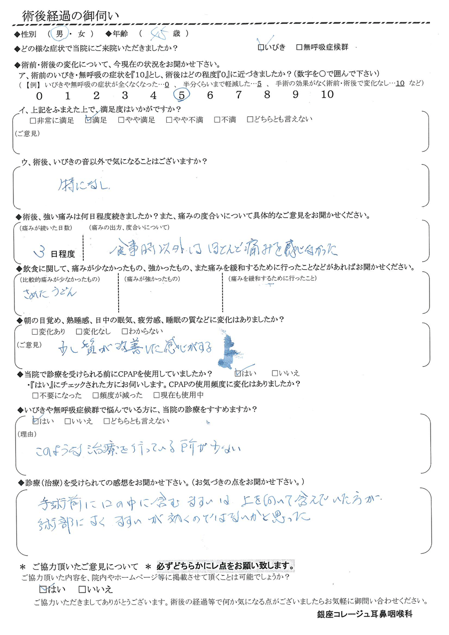 ア, 術前のいびき・無呼吸の症状を『10』だったとすると、術後はどの程度になりましたか? 【5】