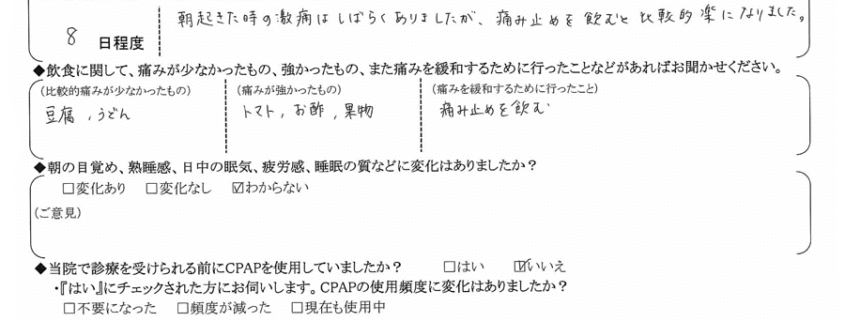 (痛みの程度について) 朝起きた時の激痛はしばらくありましたが、痛み止めを飲むと比較的、楽になりました。