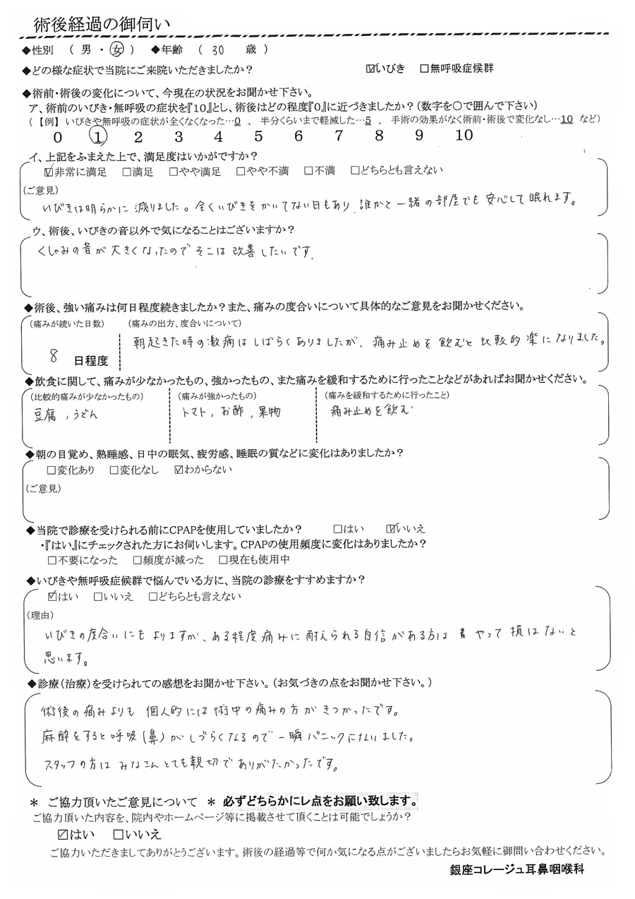 ア, 術前のいびき・無呼吸の症状を『10』だったとすると、術後はどの程度になりましたか? 【1】