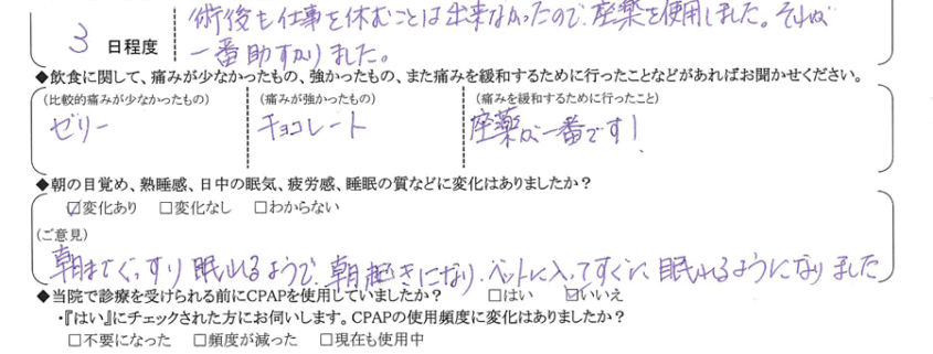 Q.術後、強い痛みは何日程度続きましたか?また、痛みの度合いについて具体的なご意見をお聞かせください。
