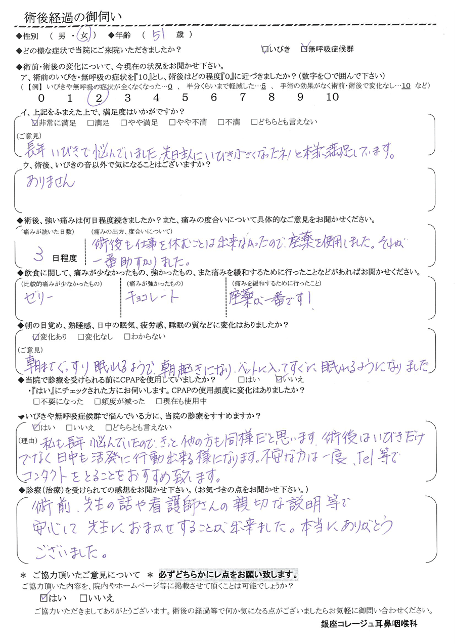 (理由) 私も長年、悩んでいたので、きっと他の方も同様だと思います。術後はいびきだけではなく、日中も活発に行動できる様になります。不安な方は一度、電話などでコンタクトをとることをお勧め致します。