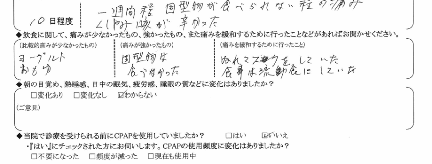 (痛みの程度について) 一週間程、固形物が食べられない程の痛み。くしゃみ・咳が辛かった。
