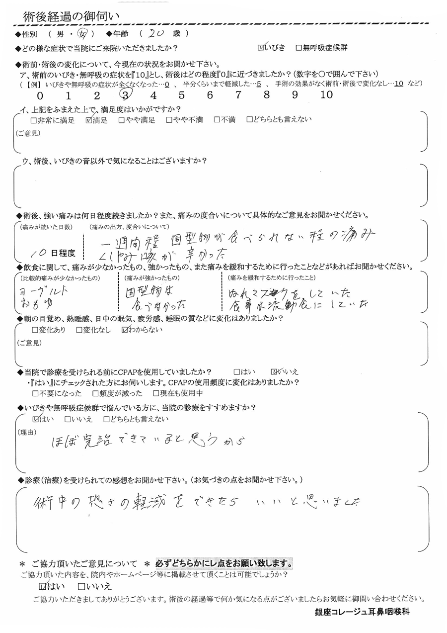 ア, 術前のいびき・無呼吸の症状を『10』だったとすると、術後はどの程度になりましたか? 【3】