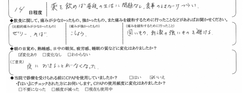 (痛みの程度について) 薬を飲めば、普段の生活に問題なし。食事の時だけ辛い。