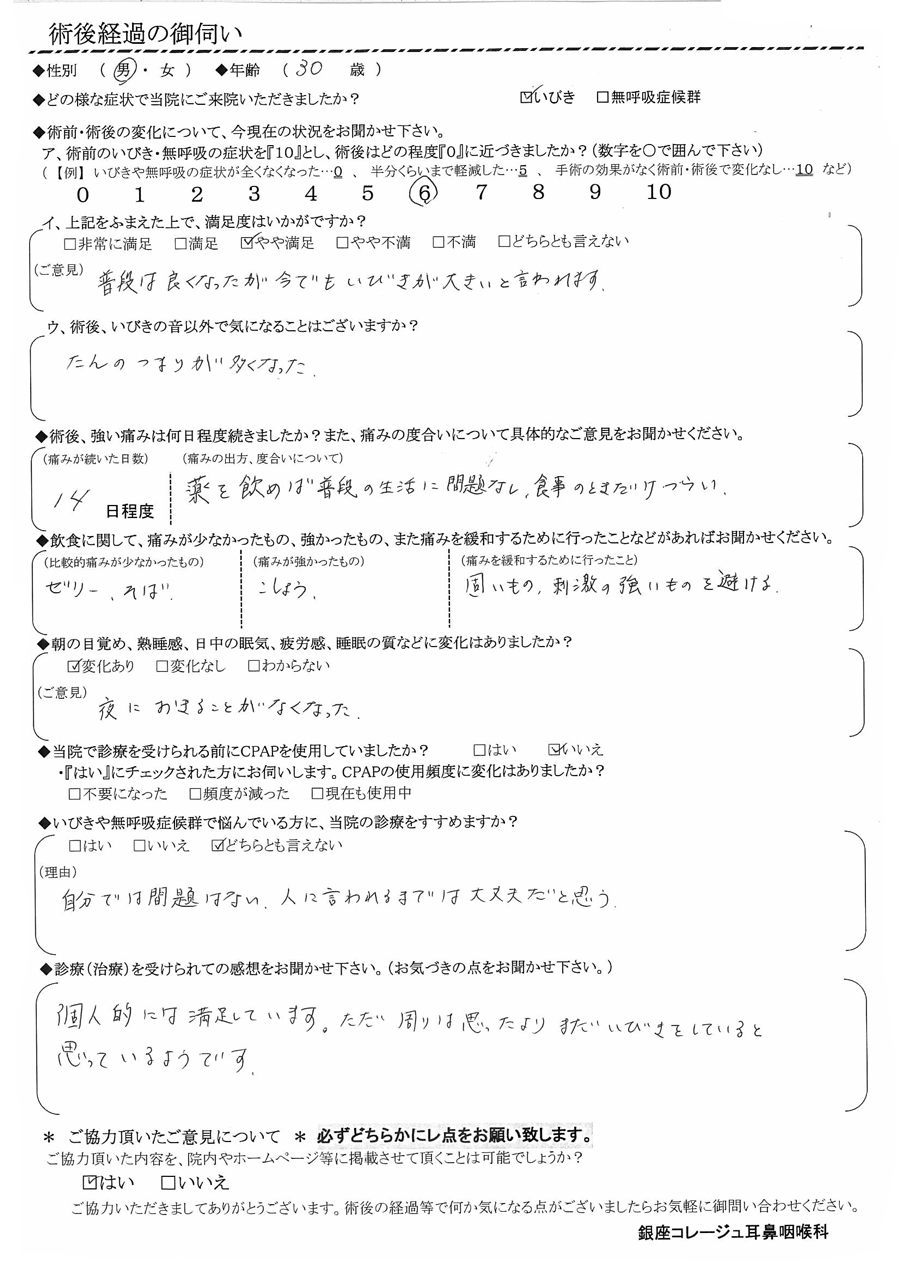ア, 術前のいびき・無呼吸の症状を『10』だったとすると、術後はどの程度になりましたか? 【6】