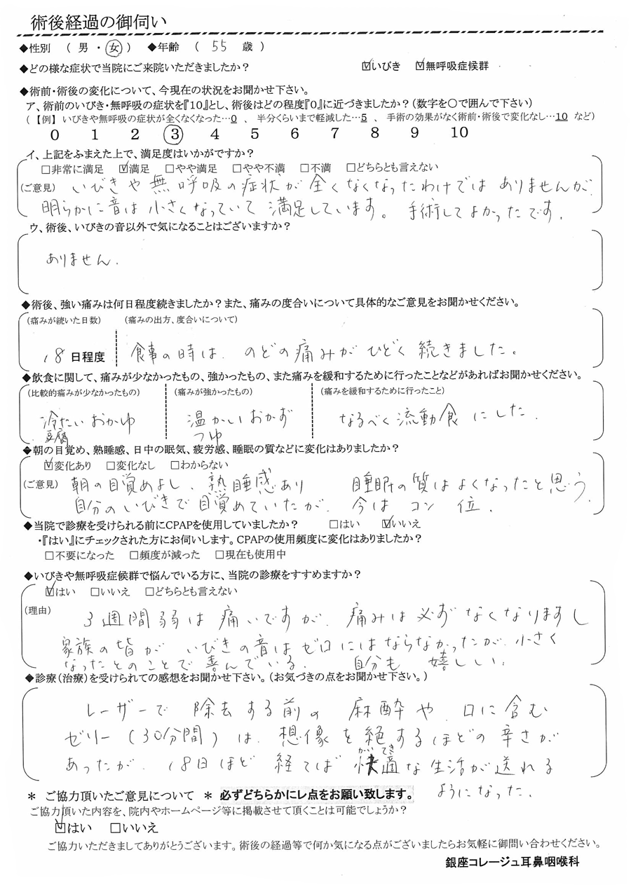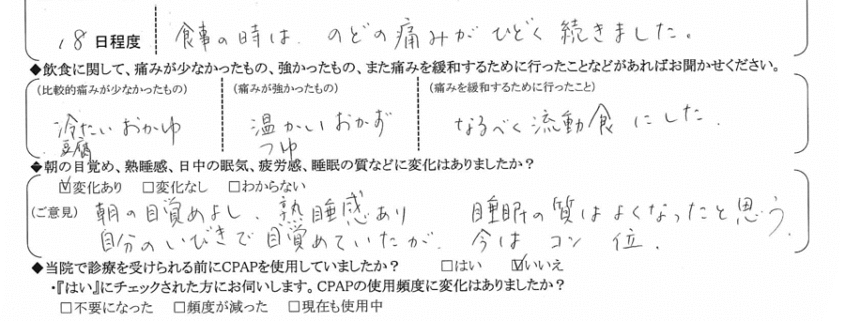 (ご意見) いびきや無呼吸の症状が、全く無くなったわけではありませんが、明らかに音は小さくなっていて満足しています。手術して良かったです。