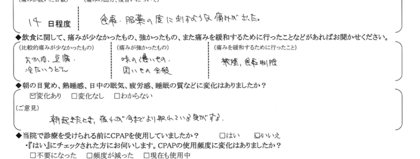 (痛みの程度について) 食事・服薬の度に刺すような痛みが出た。
