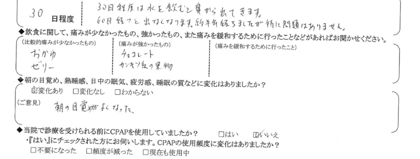 (痛みの程度について) 30日程度は水を飲むと鼻から出てきます。60日経つと、出なくなります。