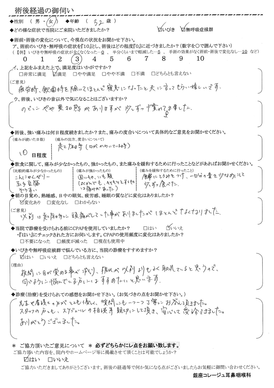 ア, 術前のいびき・無呼吸の症状を『10』だったとすると、術後はどの程度になりましたか? 【3】