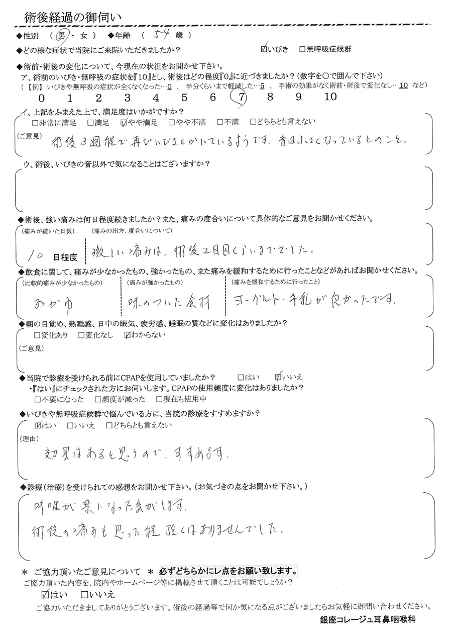 (ご意見)  術後3週間程でいびきをかいているそうです。音は小さくなっているとのこと。