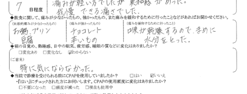 (痛みの程度について) 痛みが軽い方でしたが、違和感があった。我慢できる痛さでした。