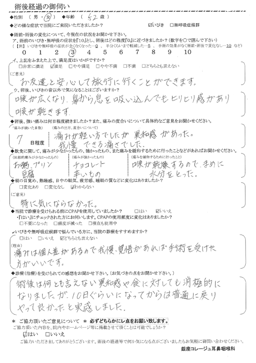 ア, 術前のいびき・無呼吸の症状を『10』だったとすると、術後はどの程度になりましたか? 【3】