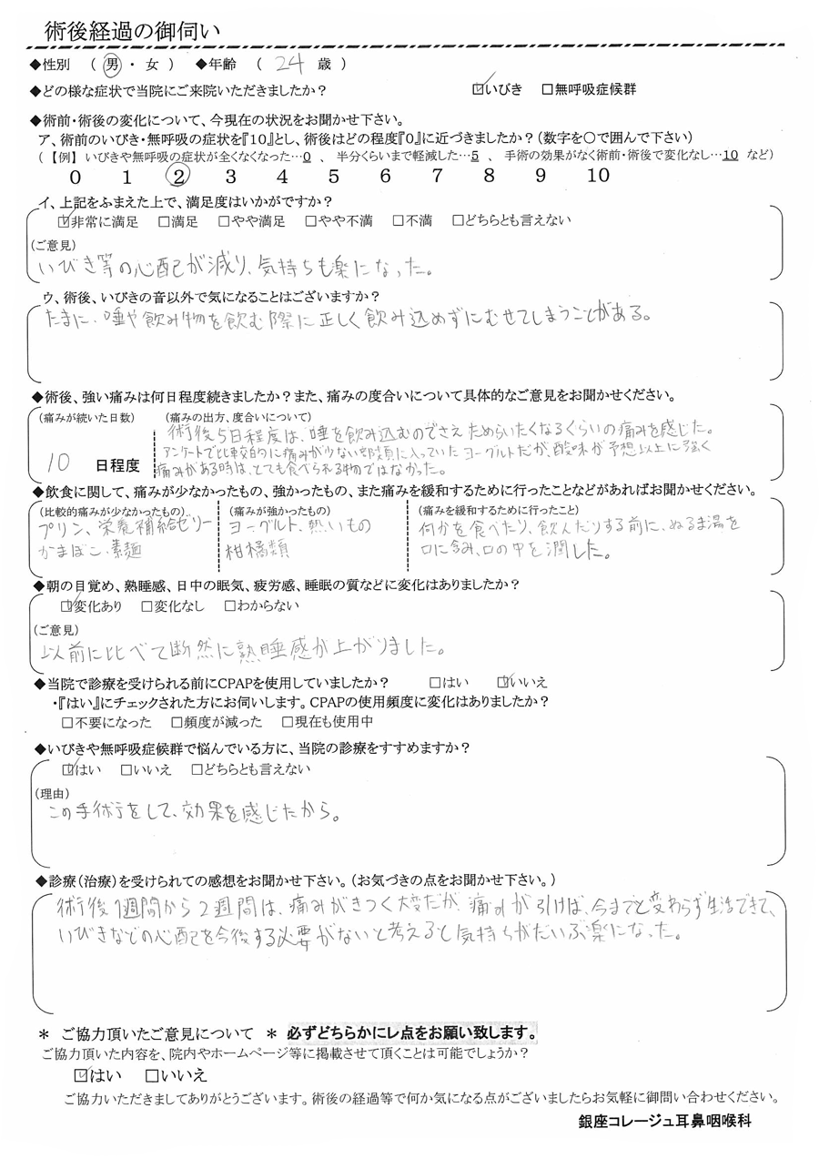 A: 術後1~2週間は痛みがキツく大変だが、痛みが引けば今までと変わらず生活できて、いびき等の心配を今後する必要がないと考えると気持ちが楽になった。